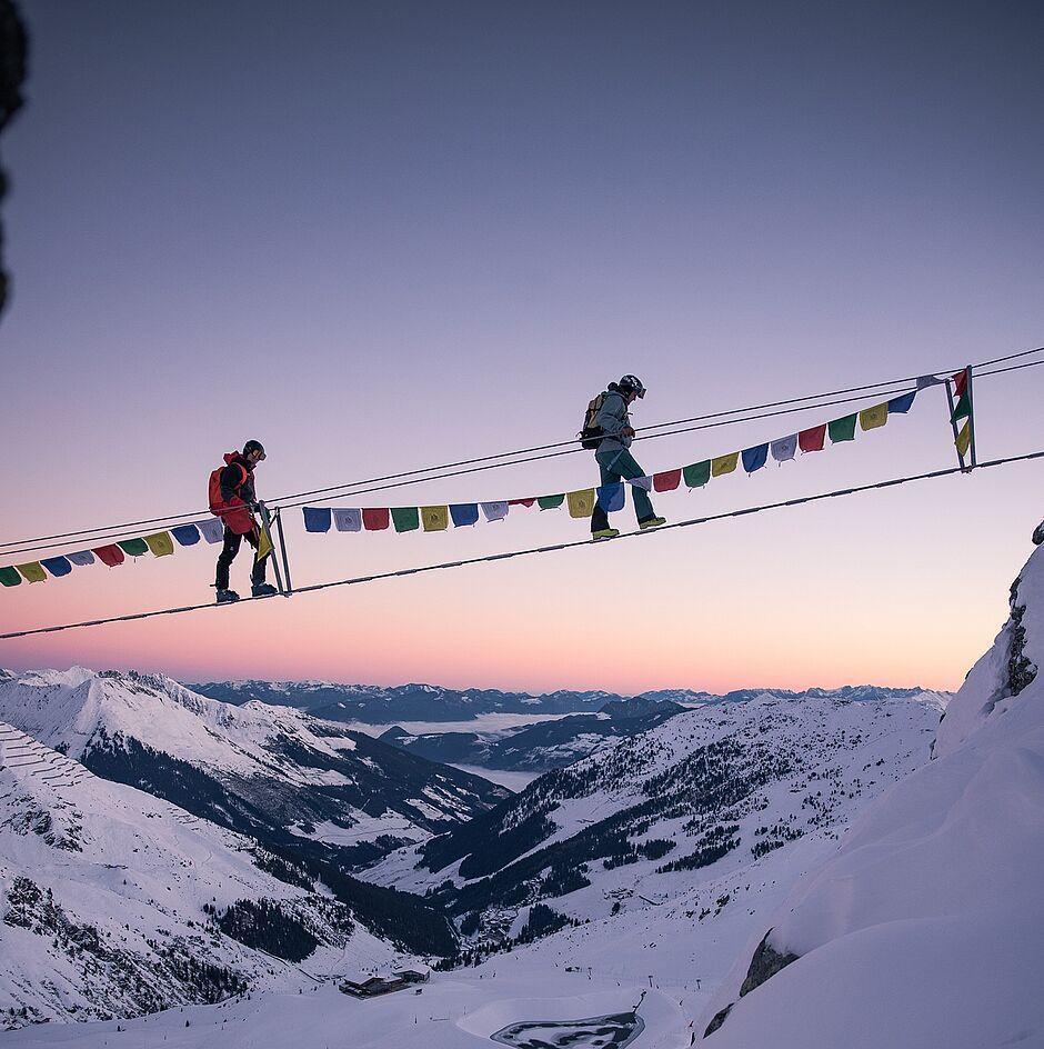 Numerous well-maintained winter hiking trails in the Zillertal lead through the region’s stunning natural landscape. Especially popular is the winter hiking route from the mountain station of the Hochzillertal–Kaltenbach ski area to the Hubertus Chapel, combining spectacular views with tranquil winter surroundings. Another highlight for experienced mountaineers is the winter via ferrata in Hochfügen-Pfaffenbichl, featuring the impressive Nepal Bridge, which adds an exciting dimension to the winter experience.